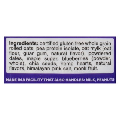 INGREDIENTS: Certified Gluten Free Whole Grain Rolled Oats, Pea Protein Isolate, Oat Mylk (Oat Flour, Guar Gum, Natural Flavors), Powdered Dates, Maple Sugar, Blueberries (Powder, Whole), Chia Seeds, Hemp Hearts, Natural Flavors, Himalayan Pink Salt, Monk Fruit.