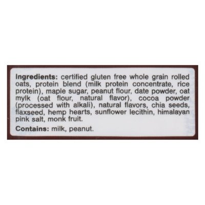 INGREDIENTS: Certified Gluten Free Whole Grain Rolled Oats, Protein Blend (Milk Protein Concentrate, Rice Protein), Maple Sugar, Peanut Flour, Date Powder, Oat Mylk (Oat Flour, Natural Flavor), Cocoa Powder (Processed with Alkali), Natural Flavors, Chia Seeds, Flaxseed, Hemp Hearts, Sunflower Lecithin, Himalayan Pink Salt, Monk Fruit.