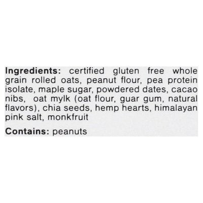 INGREDIENTS: Certified Gluten Free Whole Grain Rolled Oats, Peanut Flour, Pea Protein Isolate, Maple Sugar, Powdered Dates, Cacao Nibs, Oat Mylk (Oat Flour, Guar Gum, Natural Flavors), Chia Seeds, Hemp Hearts, Himalayan Pink Salt, Monkfruit.