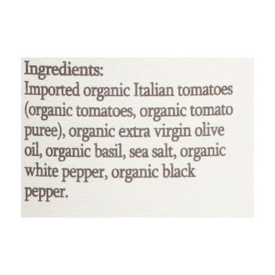 INGREDIENTS: Imported Organic Italian Tomatoes (Organic Tomatoes, Organic Tomato Puree), Organic Extra Virgin Olive Oil, Organic Basil, Sea Salt, Organic White Pepper, Organic Black Pepper.