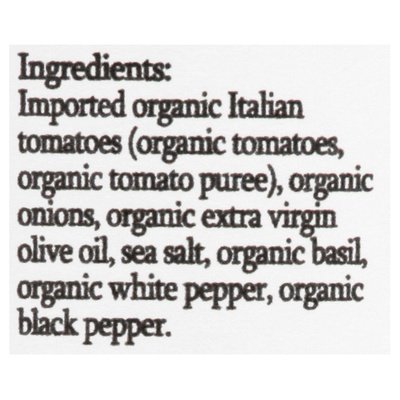 INGREDIENTS: Imported Organic Italian Tomatoes (Organic Tomatoes, Organic Tomato Puree), Organic Onions, Organic Extra Virgin Olive Oil, Sea Salt, Organic Basil, Organic White Pepper, Organic Black Pepper.