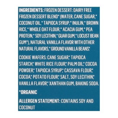 INGREDIENTS: Frozen Dessert: Dairy Free Frozen Dessert Blend (Organic), Water, Cane Sugar (Organic), Coconut Oil (Organic), Tapioca Syrup (Organic), Inulin (Organic), Brown Rice (Organic), Whole Oat Flour, Acacia Gum (Organic), Pea Protein (Organic), Soy Lecithin (Organic), Guar Gum (Organic), Locust Bean Gum (Organic), Natural Vanilla Flavor with Other Natural Flavors (Organic), Ground Vanilla Beans (Organic). Cookie Wafers: Cane Sugar (Organic), Tapioca Starch (Organic), White Rice Flour (Organic), Palm Oil (Organic), Cocoa Powder (Organic), Tapioca Syrup (Organic), Cassava Flour (Organic), Cocoa (Organic), Potato Flour (Organic), Salt, Soy Lecithin (Organic), Vanilla Flavor (Organic), Xanthan Gum, Baking Soda.