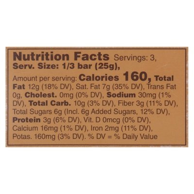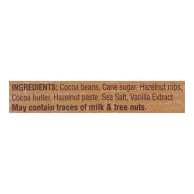INGREDIENTS: Cocoa Beans, Cane Sugar Hazelnut Nibs, Cocoa Butter, Hazelnut Paste, Sea Salt, Vanilla Extract.