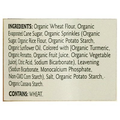 INGREDIENTS: Organic Wheat Flour, Organic Evaporated Cane Sugar, Organic Sprinkles (Organic Sugar, Organic Rice Flour, Organic Potato Starch, Organic Sunflower Oil, Colored with [Organic Turmeric, Organic Annatto, Organic Fruit Juice, Organic Vegetable Juice], Citric Acid, Sodium Bicarbonate), Leavening (Sodium Bicarbonate, Monocalcium Phosphate, Non-GMO Corn Starch), Salt, Organic Potato Starch, Organic Cassava Starch.