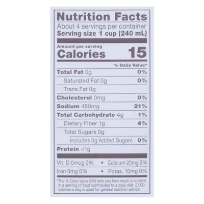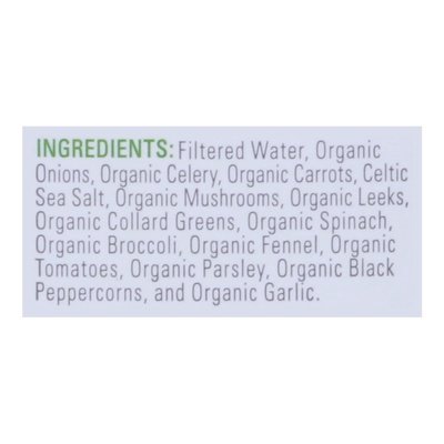 INGREDIENTS: Filtered Water, Organic Onions, Organic Celery, Organic Carrots, Celtic Sea Salt, Organic Mushrooms, Organic Leeks, Organic Collard Greens, Organic Spinach, Organic Broccoli, Organic Fennel, Organic Tomatoes, Organic Parsley, Organic Black Peppercorns, and Organic Garlic.
