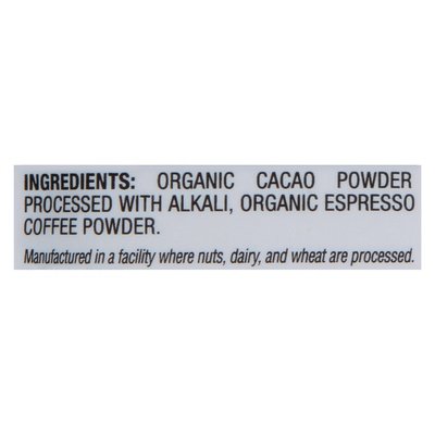 INGREDIENTS: Organic Cacao Powder Processed with Alkali, Organic Espresso Powder.