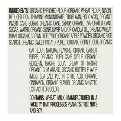 INGREDIENTS: Organic Enriched Flour (Organic Wheat Flour, Niacin, Reduced Iron, Thiamine Mononitrate, Riboflavin, Folic Acid), Organic Invert Cane Sugar, Organic Cane Syrup, Organic Evaporated Cane Sugar, Water, Organic Sunflower and/or Canola Oil, Organic Wheat Bran, Organic Brown Rice Syrup, Organic Apple Powder, Organic Rice Starch, Organic Sweet Potato Puree, Organic Corn Flour, Organic Oat Flour, Natural Flavors, Organic Carrot Puree, Organic Dried Cane Syrup, Organic Glycerin, Baking Soda, Cream of Tartar, Organic Gum Arabic, Organic Butter Flavor Milk), Sea Salt, Pectin, Citric Acid, Organic Cinnamon, Organic Flavor, Organic Annatto Extract [for Color].
