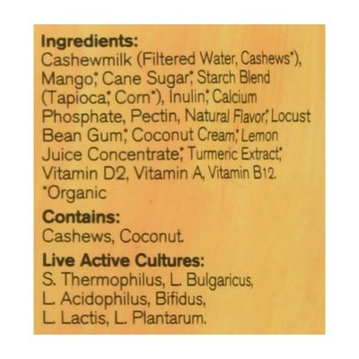 INGREDIENTS: Cashewmilk (Filtered Water, Cashews (Organic)), Mango (Organic), Cane Sugar (Organic), Starch Blend (Tapioca (Organic), Corn (Organic)), Inulin (Organic), Calcium Phosphate, Pectin, Natural Flavor (Organic), Guar Gum (Organic), Coconut Cream (Organic), Agar, Lemon Juice Concentrate (Organic), Turmeric Extract (Organic), Vitamin D2, Vitamin A Vitamin B12.