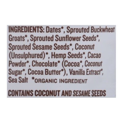 INGREDIENTS: Dates (Organic Ingredient), Sprouted Buckwheat Groats (Organic Ingredient), Sprouted Sunflower Seeds (Organic Ingredient), Sprouted Sesame Seeds (Organic Ingredient), Coconut (Unsulphured) (Organic Ingredient), Hemp Seeds (Organic Ingredient), Cacao Powder (Organic Ingredient), Chocolate (Organic Ingredient), (Cocoa [Organic Ingredient], Coconut Sugar [Organic Ingredient], Cocoa Butter [Organic Ingredient]), Vanilla Extract (Organic Ingredient), Sea Salt.