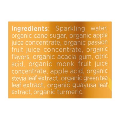 INGREDIENTS: Sparkling Water, Organic Cane Sugar, Organic Apple Juice Concentrate, Organic Passion Fruit Juice Concentrate, Organic Flavors, Organic Acacia Gum, Citric Acid, Organic Monk Fruit Juice Concentrate, Apple Acid, Organic Stevia Leaf Extract, Organic Green Tea Leaf Extract, Organic Guayusa Leaf Extract, Organic Turmeric.