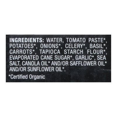 INGREDIENTS: Filtered Water, Tomato Paste (Certified Organic), Potatoes (Certified Organic), Onions (Certified Organic), Celery (Certified Organic), Basil (Certified Organic), Carrots (Certified Organic), Tapioca Starch Flour (Certified Organic), Evaporated Cane Sugar (Certified Organic), Garlic (Certified Organic), Sea Salt, Expeller Pressed Canola Oil (Certified Organic) and/or Safflower Oil (Certified Organic) and/or Sunflower Oil.