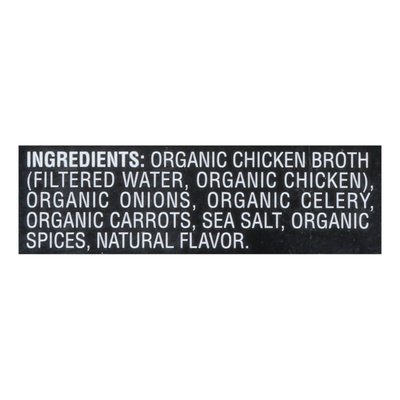 INGREDIENTS: Organic Chicken Broth (Filtered Water, Organic Chicken), Organic Onions, Organic Celery, Organic Carrots, Sea Salt, Natural Chicken Flavor, Organic Spices.