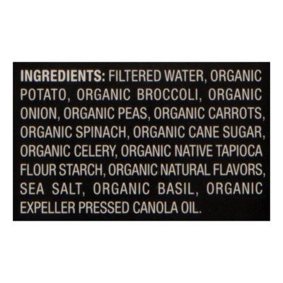 INGREDIENTS: Filtered Water, Organic Potato, Organic Broccoli, Organic Onion, Organic Peas, Organic Carrots, Organic Spinach, Organic Cane Sugar, Organic Celery, Organic Native Tapioca Flour Starch, Organic Natural Flavors, Sea Salt, Organic Basil, Organic Expeller Pressed Canola Oil.