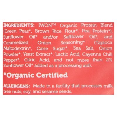 INGREDIENTS: Iwon Organic Protein Blend (Green Peas (Organic Certified), Brown Rice Flour (Organic Certified), Pea Protein (Organic Certified)), Sunflower Oil (Organic Certified) and/or Safflower Oil (Organic Certified), and Caramelized Onion Seasoning (Organic Certified) (Tapioca Maltodextrin (Organic Certified), Cane Sugar (Organic Certified), Sea Salt, Onion Powder (Organic Certified), Yeast Extract (Organic Certified), Lactic Acid, Cayenne Chili Pepper (Organic Certified), Citric Acid, and Not More than 2% Sunflower Oil (Organic Certified) Added as a Processing Aid).