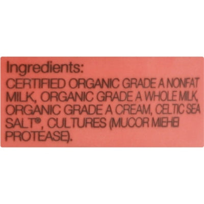 INGREDIENTS: Certified Organic Grade A Nonfat Milk, Organic Grade A Whole Milk, Organic Grade A Cream, Celtic Sea Salt, Cultures (Mucor Miehei Protease).