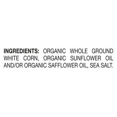 INGREDIENTS: Organic Whole Ground White Corn, Organic Sunflower Oil and/or Organic Safflower Oil, Sea Salt.
