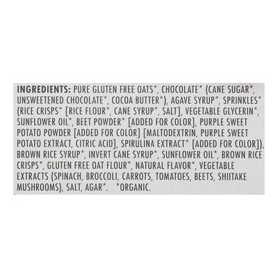 INGREDIENTS: Pure Gluten Free Oats (Organic), Chocolate (Organic) (Cane Sugar (Organic), Unsweetened Chocolate (Organic), Cocoa Butter (Organic)), Agave Syrup (Organic), Sprinkles (Organic) (Rice Crisps (Organic) [Rice Flour (Organic), Cane Syrup (Organic), Salt], Vegetable Glycerin (Organic), Sunflower Oil (Organic), Beet Powder Color (Organic), Purple Sweet Potato Powder [Maltodextrin, Purple Sweet Potato Extract, Citric Acid], Spirulina Extract Color (Organic)), Brown Rice Syrup (Organic), Brown Rice Crisps (Organic) Sunflower Oil (Organic), Cane Sugar (Organic), Natural Flavor (Organic), Vegetable Extracts (Spinach, Broccoli, Carrots, Tomatoes, Beets, Shiitake Mushrooms), Salt, Agar (Organic).