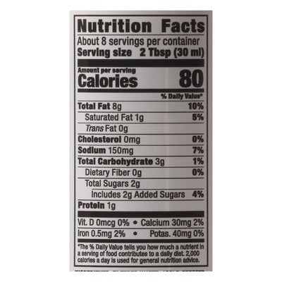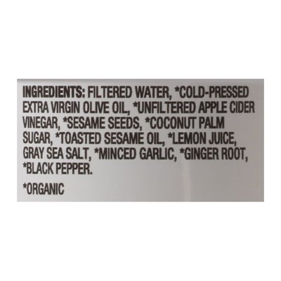 INGREDIENTS: Altered Water, Cold-Pressed Extra Virgin Olive Oil (Organic), Unfiltered Apple Cider Vinegar (Organic), Sesame Seeds (Organic), Coconut Palm Sugar (Organic), Toasted Sesame Oil (Organic), Lemon Juice (Organic), Gray Sea Salt, Minced Garlic (Organic), Ginger Root (Organic), Black Pepper (Organic).