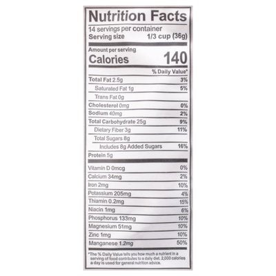 INGREDIENTS: Sprouted Gluten Free Organic Whole Oats, Organic Coconut Sugar, Organic Cacao Nibs, Organic Cacao, Unrefined Salt, Organic Vanilla.