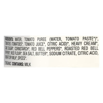 INGREDIENTS: Water, Tomato Puree (Water, Tomato Paste (Organic)), Tomatoes (Tomatoes (Organic), Tomato Juice (Organic), Citric Acid) (Organic), Heavy Cream (Organic), Cane Sugar (Organic), Cornstarch (Organic), Red Bell Peppers (Organic), Roasted Red Bell Peppers (Organic), Rice Flour (Organic), Sea Salt, Butter (Organic), Sodium Citrate, Citric Acid, Nonfat Dry Milk (Organic), Spices (Organic).