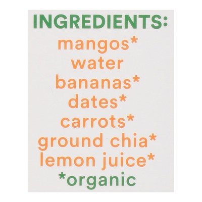 INGREDIENTS: Mangos (Organic), Water (Organic), Bananas (Organic), Dates (Organic), Carrots (Organic), Ground Chia (Organic), Lemon Juice (Organic).