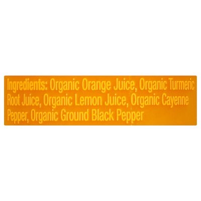 INGREDIENTS: Organic Orange Juice, Organic Turmeric Root Juice, Organic Lemon Juice, Organic Cayenne Pepper, Organic Ground Black Pepper.