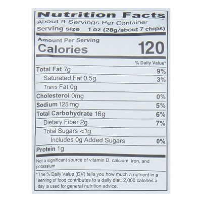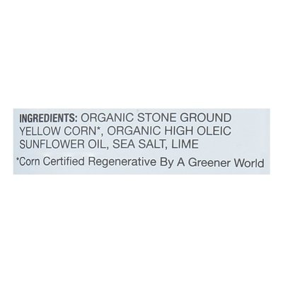 INGREDIENTS: Organic Stone Ground Yellow Corn (Corn Certified Regenerative by a Greener World), Organic High Oleic Sunflower Oil, Sea Salt, Lime.