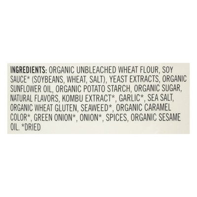 INGREDIENTS: Organic Unbleached Wheat Flour, Soy Sauce (Dried) (Soybeans, Wheat, Salt), Yeast Extracts, Organic Sunflower Oil, Organic Potato Starch, Organic Sugar, Natural Flavors, Kombu Extract (Dried), Garlic (Dried), Sea Salt, Organic Wheat Gluten, Seaweed (Dried), Organic Caramel Color (Dried), Green Onion (Dried), Onion (Dried), Spices, Organic Sesame Oil.