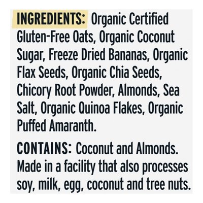 INGREDIENTS: Organic Certified Gluten-Free Oats, Organic Coconut Sugar, Freeze Dried Bananas, Organic Flax Seeds, Organic Chia Seeds, Chicory Root Powder, Almonds, Sea Salt, Organic Quinoa Flakes, Organic Puffed Amaranth.