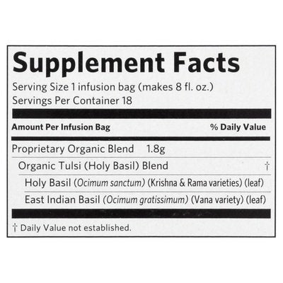 PRODUCT DETAILS: Herbal Supplement. USDA Organic. Vegan. Vegetarian. Gluten free. Certified Organic by Control Union-801983. Product produced and processed according to NPOP Standard of India & USDA-NOP. Halal. Caffeine free. Non GMO Project Verified. nongmoproject.org. Stress relieving & energizing. At the heart of Organic India is our commitment to be a living embodiment of love & consciousness in action. Small Family Farmers: Empowering small family farmers in India to cultivate regenerative, organic farmland. Revitalizing communities through fair wages, education, healthcare, access to clean water & job skills training. Regenerative Agriculture: Regenerating soil health & fertility. Improving water retention & sequestering carbon. Restoring vibrant health to the environment. Healthy Conscious Living: Celebrating the interconnectedness of life. Cultivating the health of our planet, our farmers & you. Pictured on the front is one of our beloved farmers or a family member. Revered in India as The Queen of Herbs, Tulsi (Holy Basil) is an adaptogenic herb that has been used for more than 5,000 years to: Aid in stress relief & uplift mood. Support the immune system. Support the natural detoxification process. Tulsi original three sacred varieties of spicy, powerful tulsi (Rama, vana and krishna) create a restorative, calming yet energizing infusion. Individually wrapped for freshness. OrganicIndiaUSA.com. www.controlunion.com. Certified B Corporation. Organic India is committed to responsible packaging. This carton is made from 100% recycled paperboard, with a minimum of 30% post-consumer content. Our infusion bags are made from unbleached, biodegradable fiber. Please support our environment by recycling this package. Fairtrade: Krishna tulsi, vana tulsi, rama tulsi: fairtrade certified & sourced from fairtrade producers. Total 100%. Visit www.info fairtrade.net. (These statements have not been evaluated by the FDA. This product is not intended to diagnose, treat, cure or prevent any disease). Product of India.