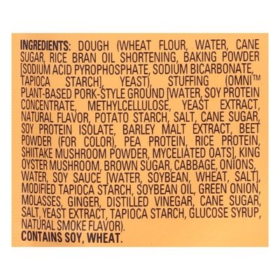 INGREDIENTS: Dough (Wheat Flour, Water, Cane Sugar, Rice Bran Oil Shortening, Baking Powder [Sodium Acid Pyrophosphate, Sodium Bicarbonate, Tapioca Starch], Yeast), Stuffing (Omni Plant-Based Pork-Style Ground [Water, Soy Protein Concentrate, Methylcellulose, Yeast Extract, Natural Flavor, Potato Starch, Salt, Cane Sugar, Soy Protein Isolate, Barley Malt Extract, Beet Powder (for Color), Pea Protein, Rice Protein, Shitake Mushroom Powder, Myceliated Oats], King Oyster Mushroom, Brown Sugar, Cabbage, Onions, Water, Soy Sauce [Water, Soybean, Wheat, Salt], Modified Tapioca Starch, Soybean Oil, Green Onion, Molasses, Ginger, Distilled Vinegar, Cane Sugar, Salt Yeast Extract, Tapioca Starch, Glucose Syrup, Natural Smoke Flavor).