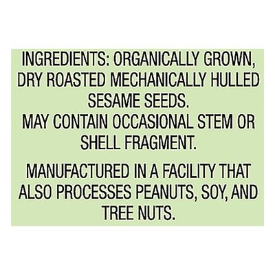 INGREDIENTS: Organically Grown, Dry Roasted Mechanically Hulled Sesame Seeds.