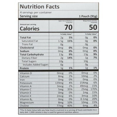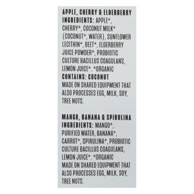 INGREDIENTS: Mango Banana Spirulina (2 pouches): Mango (Organic), Purified Water, Banana (Organic), Carrot (Organic), Spirulina (Organic), Probiotic Culture Bacillus Coagulans, Lemon Juice (Organic). Apple Cherry Elderberry (2 pouches): Apple (Organic), Cherry (Organic), Coconut Milk (Organic), (Coconut (Organic), Water), Sunflower Lecithin (Organic), Beet (Organic), Elderberry Juice Powder (Organic), Probiotic Culture Bacillus Coagulans, Lemon Juice (Organic).