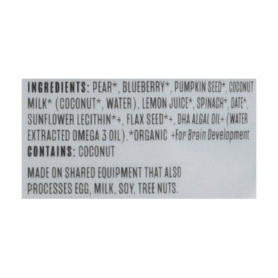 INGREDIENTS: Pear (Organic), Blueberry (Organic), Pumpkin Seed (Organic), Coconut Milk (Organic) (Coconut (Organic), Water), Lemon Juice (Organic), Spinach (Organic), Date (Organic), Sunflower Lecithin (Organic) (for Brain Development), Flax Seed (Organic) (for Brain Development), DHA Algal Oil (for Brain Development) (Water Extracted Omega 3 Oil).