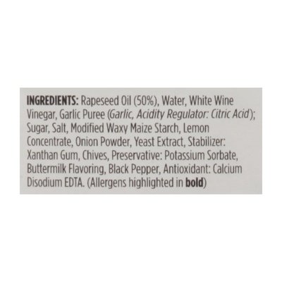 DESCRIPTION: Soy Free. Vegan. Gluten Free Non-GMO. Awesome taste epic texture. onlyplantbasedfoods.com. Product of Northern Ireland. < Rapeseed Oil (50%), Water, White Wine Vinegar, Garlic Puree Garlic, Acidity Regulator: Citric Acid); Sugar, Salt, Modified Waxy Maize Starch, Lemon Concentrate, Onion Powder, Yeast Extract, Stabilizer: Xanthan Gum, Chives, Preservative: Potassium Sorbate, Buttermilk Flavoring, Black Pepper, Antioxidant: Calcium Disodium EDTA, (Allergens Highlighted in Bold).