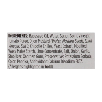 DESCRIPTION: Soy free. Gluten free. Vegan. Non GMO. Awesome taste epic texture. onlyplantbasedfoods.com. Product of Northern Ireland. < Rapeseed Oil, Water, Sugar, Spirit Vinegar, Tomato Puree, Dijon Mustard (Water, Mustard Seeds, Spirit Vinegar, Salt); Chipotle Chilies, Yeast Extract, Modified Waxy Maize Starch, Lime Concentrate, Salt, Onion, Garlic, Stabilizer: Xanthan Gum, Preservative: Potassium Sorbate, Color: Paprika, Antioxidant: Calcium Disodium EDTA, (Allergens Highlighted in Bold).