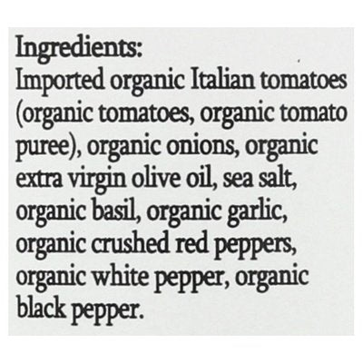 INGREDIENTS: Imported Organic Italian Tomatoes (Organic Onions, Organic Tomato Puree), Organic Onions, Organic Extra Virgin Olive Oil, Sea Salt, Organic Basil, Organic Garlic, Organic Crushed Red Peppers, Organic White Pepper, Organic Black Pepper.
