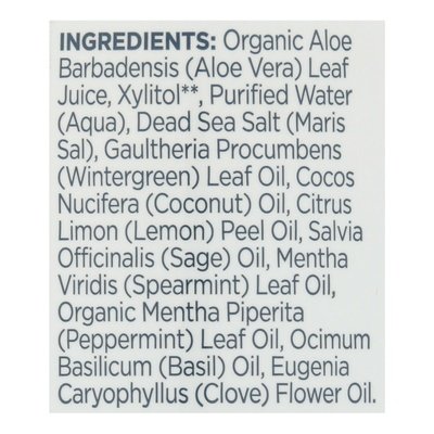 INGREDIENTS: Organic Aloe Barbadensis (Aloe Vera) Leaf Juice, Xylitol (Non GMO Xylitol), Purified Water (Aqua), Dead Sea Salt (Maris Sal), Gaultheria Procumbens (Wintergreen) Leaf Oil, Cocos Nucifera (Coconut) Oil, Citrus Limon (Lemon) Peel Oil, Salvia Officinalis (Sage) Oil, Mentha Viridis (Spearmint) Leaf Oil, Organic Mentha Piperita (Peppermint) Leaf Oil, Ocimum Basilicum (Basil) Oil, Eugenia Caryophyllus (Clove) Flower Oil.