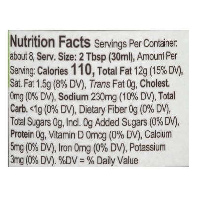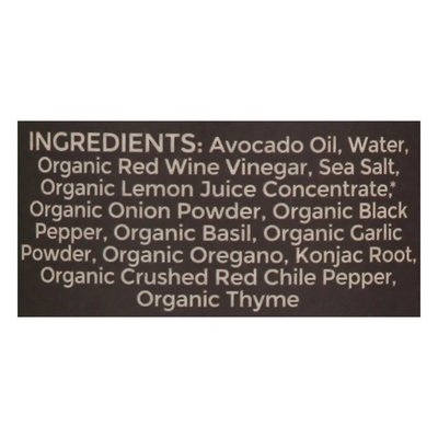 INGREDIENTS: Avocado Oil, Water, Organic Red Wine Vinegar, Sea Salt, Organic Lemon Juice Concentrate (Adds a Negligible Amount of Sugar), Organic Onion Powder, Organic Black Pepper, Organic Basil, Organic Garlic Powder, Organic Oregano, Konjac Root, Organic Crushed Red Chile Pepper, Organic Thyme.