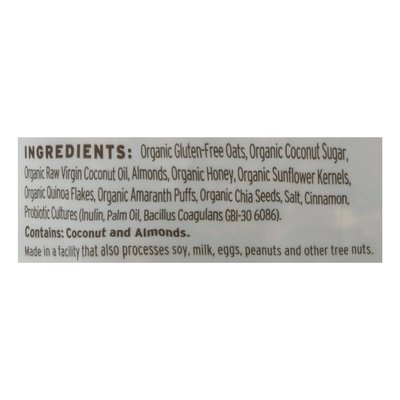 INGREDIENTS: Organic Certified Gluten-Free Oats, Organic Coconut Sugar, Organic Coconut Oil, Almonds, Organic Honey, Organic Sunflower Seeds, Organic Quinoa Flakes, Organic Puffed Amaranth, Organic Chia Seeds, Sea Salt, Cinnamon, Probiotic Cultures (Inulin, Palm Oil, Bacillus Coagulans Gbi-30 6086).