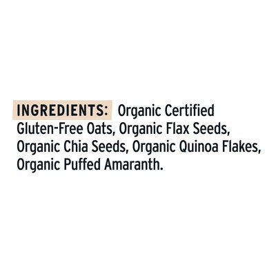 INGREDIENTS: Organic Certified Gluten-Free Oats, Organic Flax Seeds, Organic Chia Seeds, Organic Quinoa Flakes, Organic Puffed Amaranth.