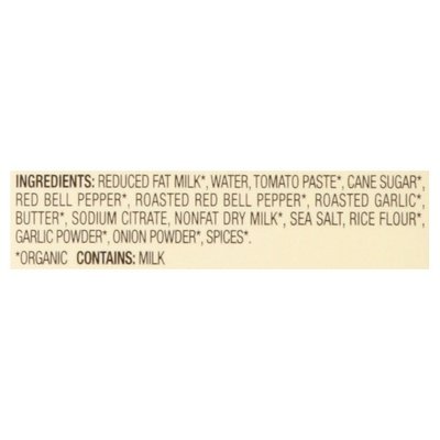 INGREDIENTS: Reduced Fat Milk (Organic), Water, Tomato Paste (Organic), Cane Sugar (Organic), Red Bell Pepper (Organic), Roasted Red Bell Pepper (Organic), Roasted Garlic (Organic), Butter (Organic), Sodium Citrate, Nonfat Dry Milk (Organic), Sea Salt, Rice Flour (Organic), Garlic Powder (Organic), Onion Powder (Organic), Spices (Organic).