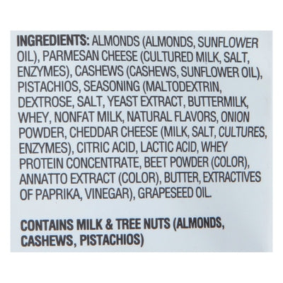 INGREDIENTS: Almonds (Almonds, Sunflower Oil), Parmesan Cheese (Cultured Milk, Salt, Enzymes), Cashews (Cashews, Sunflower Oil), Pistachios, Seasoning (Maltodextrin, Dextrose, Salt, Yeast Extract, Buttermilk, Whey, Nonfat Milk, Natural Flavors, Onion Powder, Cheddar Cheese (Milk, Salt, Cultures, Enzymes), Citric Acid, Lactic Acid, Whey Protein Concentrate, Beet Powder (Color), Annatto Extract (Color), Butter, Extractives of Paprika, Vinegar), Grapeseed Oil.