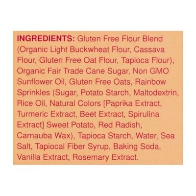 INGREDIENTS: Gluten Free Flour Blend (Organic Light Buckwheat Flour, Cassava Flour, Gluten Free Oat Flour, Tapioca Flour), Organic Fair Trade Cane Sugar, Non GMO Sunflower Oil, Gluten Free Oats, Rainbow Sprinkles (Sugar, Potato Starch, Maltodextrin, Rice Oil, Natural Colors [Paprika Extract, Turmeric Extract, Beet Extract, Spirulina Extract] Sweet Potato, Red Radish, Carnauba Wax), Tapioca Starch, Water, Sea Salt, Tapioca! Fiber Syrup, Baking Soda, Vanilla Extract, Rosemary Extract.