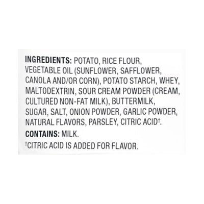 INGREDIENTS: Potato, Rice Flour, Vegetable Oil (Sunflower, Safflower, and/or Expeller Pressed Canola), Potato Starch, Tapioca Maltodextrin, Onion Powder, Garlic Powder, Sea Salt, Sugar, Natural Flavors, Lactic Acid (Lactic Acid and Citric Acid Are Added for Flavor), Citric Acid (Lactic Acid and Citric Acid Are Added for Flavor), Yeast Extract, Parsley.