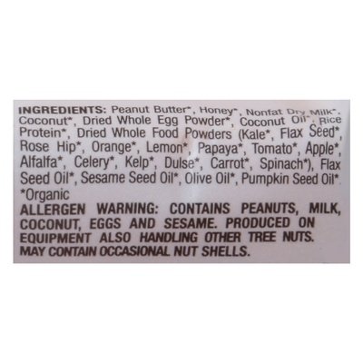 DESCRIPTION: The original refrigerated protein bar. 16 g protein. Protein 19% DV. USDA Organic. Certified Organic by QAI. Certified gluten-free. Low Glycemic: Low Glycemic Index (GI) foods digest slowly to keep you fuller, longer. See nutrition panel for fat and sat. fat content. Non-GMO Project verified. nongmoproject.org. 20+ super foods. Enjoy 1 week on the go. Our Family Story: Our dad was a health food pioneer before most folks had heard of health food. To help our king-size family eat healthy on-the-go, he mixed organic nut butter and honey with a superfood blend, took one bite and proclaimed, It's perfect! - and the original Perfect Bar recipe was born. Today, we're combining whole food protein, clean ingredients and an incredible taste to share Dad's recipe with the world. Perfect Bar - a bar so fresh, it belongs in the fridge. Take on the go for 1 week. AKA: Ashley Koff Approved. Est 2002. perfectsnacks.com. 1.866.628.8548. Get the whole nutty story at perfectsnacks.com. < Peanut Butter (Organic), Honey (Organic), Nonfat Dry Milk (Organic), Coconut (Organic), Dried Whole Egg Powder (Organic), Coconut Oil (Organic), Rice Protein (Organic), Dried Whole Food Powders (Kale [Organic], Flax Seed [Organic], Rose Hip [Organic], Orange [Organic], Lemon [Organic], Papaya [Organic], Tomato [Organic], Apple [Organic], Alfalfa [Organic], Celery [Organic], Kelp [Organic], Dulse [Organic], Carrot [Organic], Spinach [Organic]), Flax Seed Oil (Organic), Sesame Seed Oil (Organic), Olive Oil (Organic), Pumpkin Seed Oil (Organic).
