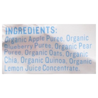 INGREDIENTS: Organic Apple Puree, Organic Blueberry Puree, Organic Pear Puree, Organic Oats, Organic Chia, Organic Quinoa, Organic Lemon Juice Concentrate.