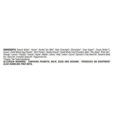 DESCRIPTION: The original refrigerated protein bar. 14 g protein. USDA Organic. Certified Organic by QAI. Gluten free. See nutrition panel for fat content. Low GI. Low Glycemic: Low Glycemic Index (GI) foods digest slowly to keep you fuller, longer. Non-GMO Project verified. nongmoproject.org. 20+ super foods. Our Family Story: Our dad was a health food pioneer before most folks had heard of health food. To help our king-size family eat healthy on-the-go, he mixed organic nut butter and honey with a superfood blend, took one bite and proclaimed, It's perfect! - and the original Perfect Bar recipe was born. Today, we're combining whole food protein, clean ingredients and an incredible taste to share Dad's recipe with the world. Perfect Bar - a bar so fresh, it belongs in the fridge. Take on the go for 1 week. AKA: Ashley Koff Approved. Est. 2002. perfectsnacks.com. Get the whole nutty story at perfectsnacks.com. < Peanut Butter (Organic), Honey (Organic), Nonfat Dry Milk (Organic), Dark Chocolate (Organic) [Chocolate (Organic)(Fair Trade Ingredients), Cane Sugar (Organic)(Fair Trade Ingredients), Cocoa Butter (Organic)(Fair Trade Ingredients)], Cocoa (Organic), Dried Whole Egg Powder (Organic), Rice Protein (Organic), Vanilla Extract (Organic), Dried Whole Food Powders [Kale (Organic), Flax Seed (Organic), Rose Hip (Organic), Orange (Organic), Lemon (Organic), Papaya (Organic), Tomato (Organic), Apple (Organic), Alfalfa (Organic), Celery (Organic), Kelp (Organic), Dulse (Organic), Carrot (Organic), Spinach (Organic)], Flax Seed Oil (Organic), Sunflower Oil (Organic), Sesame Seed Oil (Organic), Olive Oil (Organic), Pumpkin Seed Oil (Organic), Peppermint Oil.