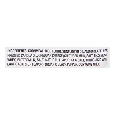 INGREDIENTS: Cornmeal, Rice Flour, Sunflower Oil and/or Expeller Pressed Canola Oil, Cheddar Cheese (Cultured Milk, Salt, Enzymes), Whey, Buttermilk, Salt, Natural Flavor, Sea Salt, Citric Acid and Lactic Acid (for Flavor), Organic Black Pepper.