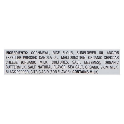 INGREDIENTS: Cornmeal, Rice Flour, Sunflower Oil and/or Expeller Pressed Canola Oil, Maltodextrin, Organic Cheddar Cheese (Organic Milk, Cultures, Salt, Enzymes), Organic Buttermilk, Salt, Natural Flavor, Sea Salt, Organic Skim Milk, Black Pepper, Citric Acid (for Flavor).